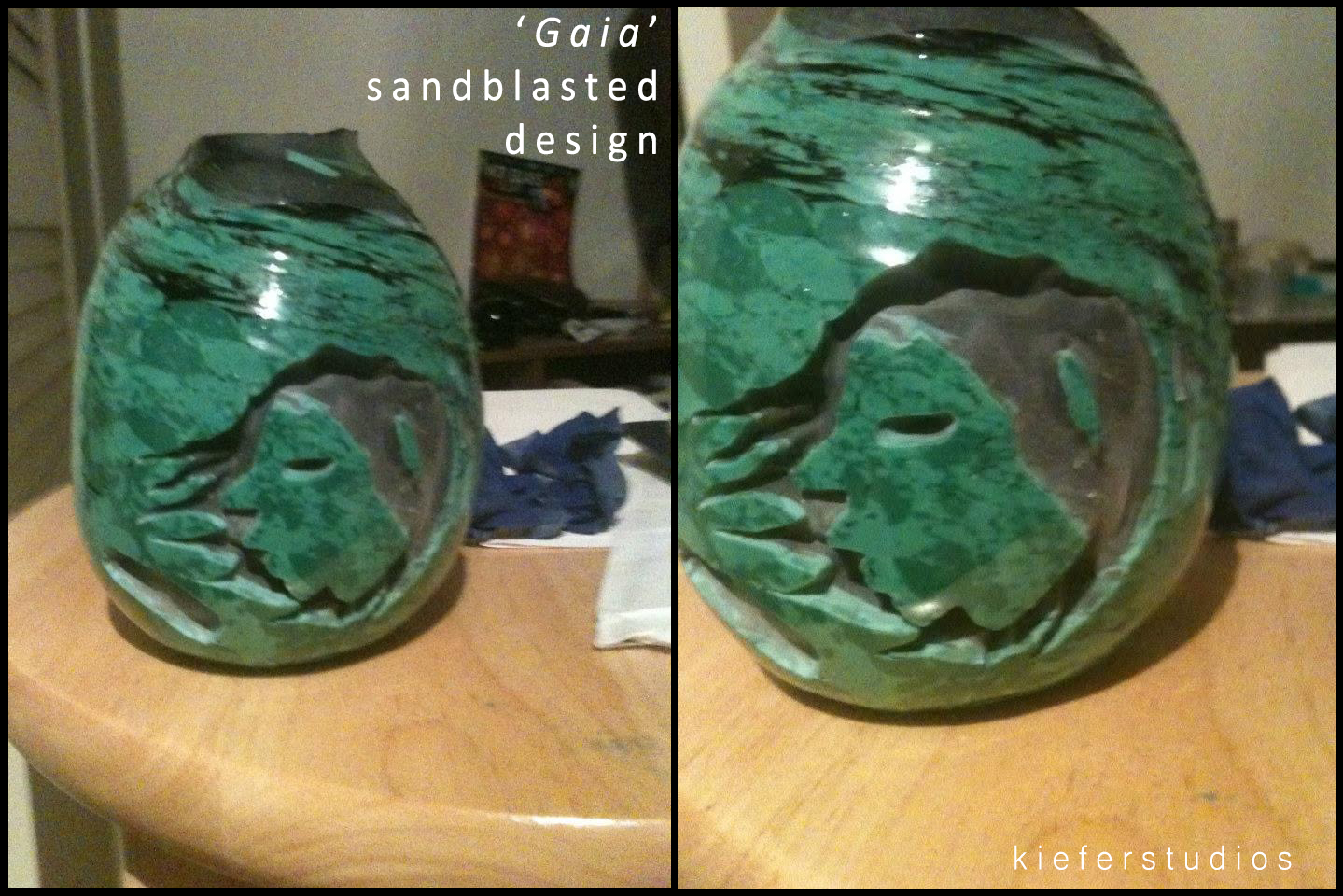I personally consider this to be my best work out of everything I've done in glass and is the result of a triple color overlay and sandblasting. 'Gaia (Crying Woman)' is the name I’ve given it due to its earthy and natural colors as well as its 2D sandblasted design displaying the face of a woman with her hand extended as she blows a swirling green mist around the exterior of the glass vessel. I was influenced and inspired by the ancient Greek personification of earth while making this. The innermost color is a beautiful golden canary yellow overlayed by a royal cobalt blue color rod (not actually black as it might appear in the photos) and is covered by a various mix of jade green frit.